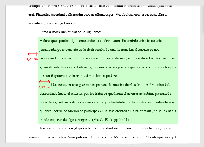 Por otro lado, hay que destacar que APA hace una distinción en citas de menos y citas de más de 40 palabras. En el primer caso, las citas van entre comillas; en caso de que la cita tenga más de 40 palabras, va en un párrafo aparte y con sangría de 1,27 cm.